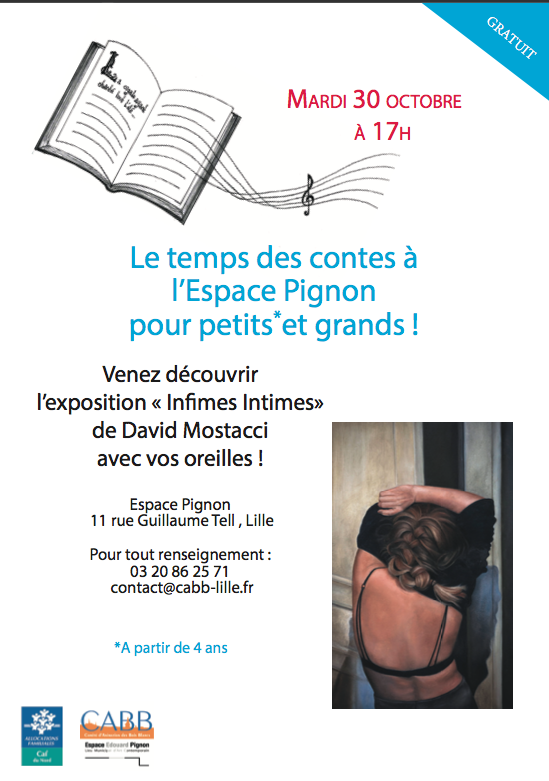 Mardi 30 octobre à 17h à l’Espace Pignon : visite contée avec François Griffault autour de l’exposition ” Infimes Intimes” . Une façon originale de découvrir l’exposition de David Mostacci. Pour petits et grands. Enfant à partir de 4 ans – Entrée libre